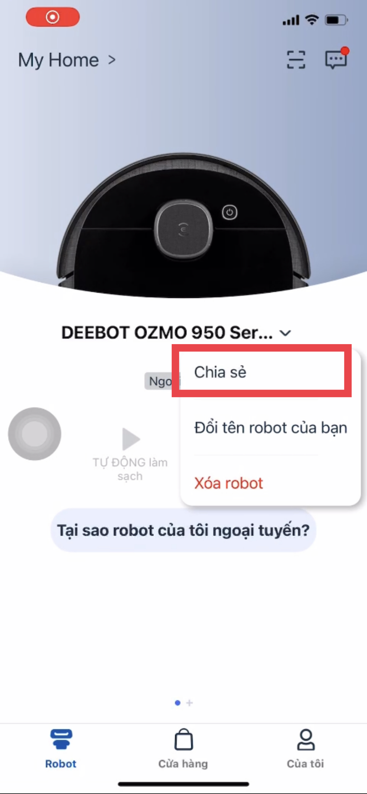 Đối với những sản phẩm thuộc hệ sinh thái thông minh Ecovacs, ứng dụng Ecovacs Homecho phép bạn chia sẻ quyền điều khiển robot thông minh cho người khác hết sức đơn giản. Sau khi đã kết nối với robot xong, bạn có thể chia sẻ quyền điều khiển robot bằng chạm vào biểu tượng ở góc trên bên trái khi đang ở giao diện chính.